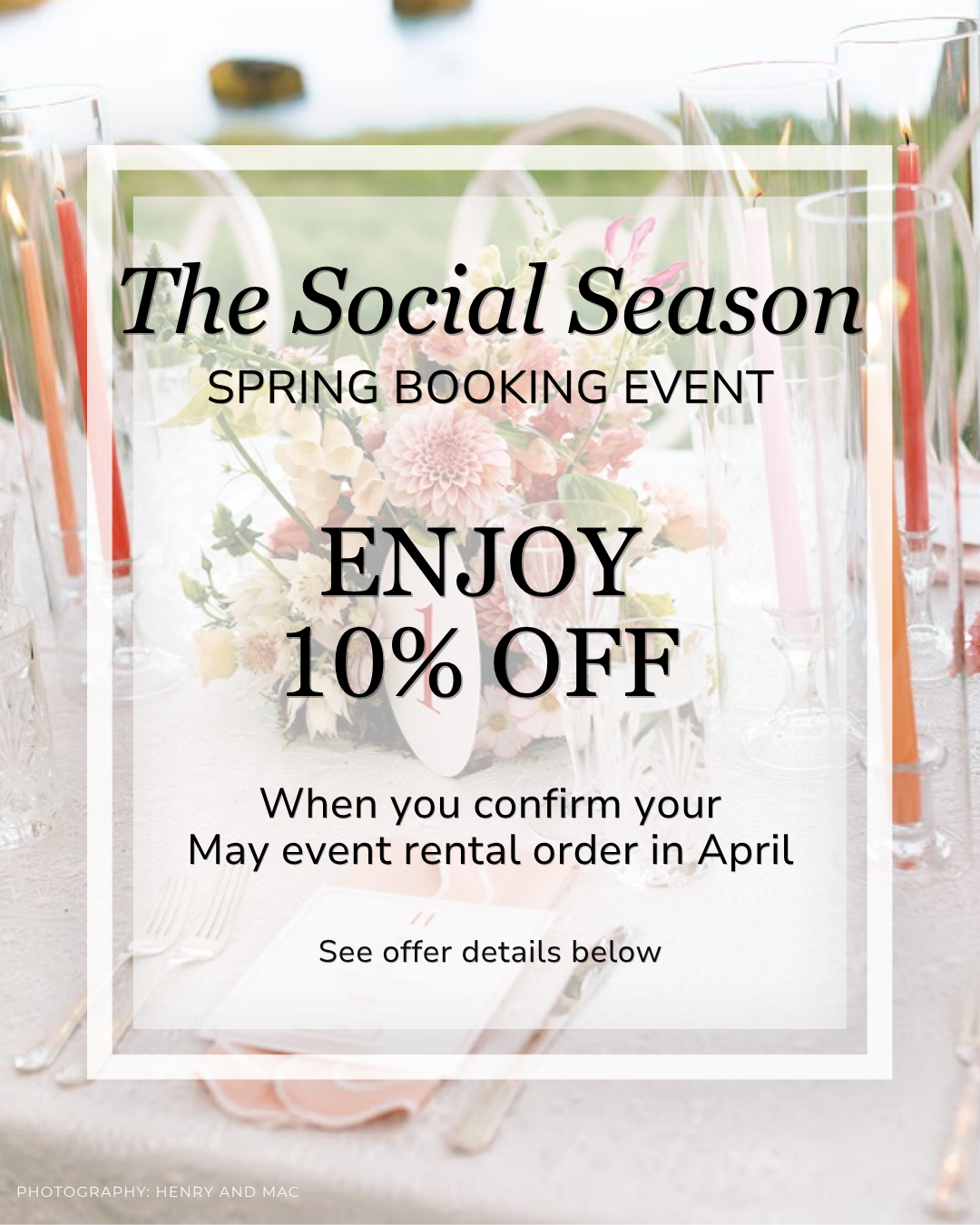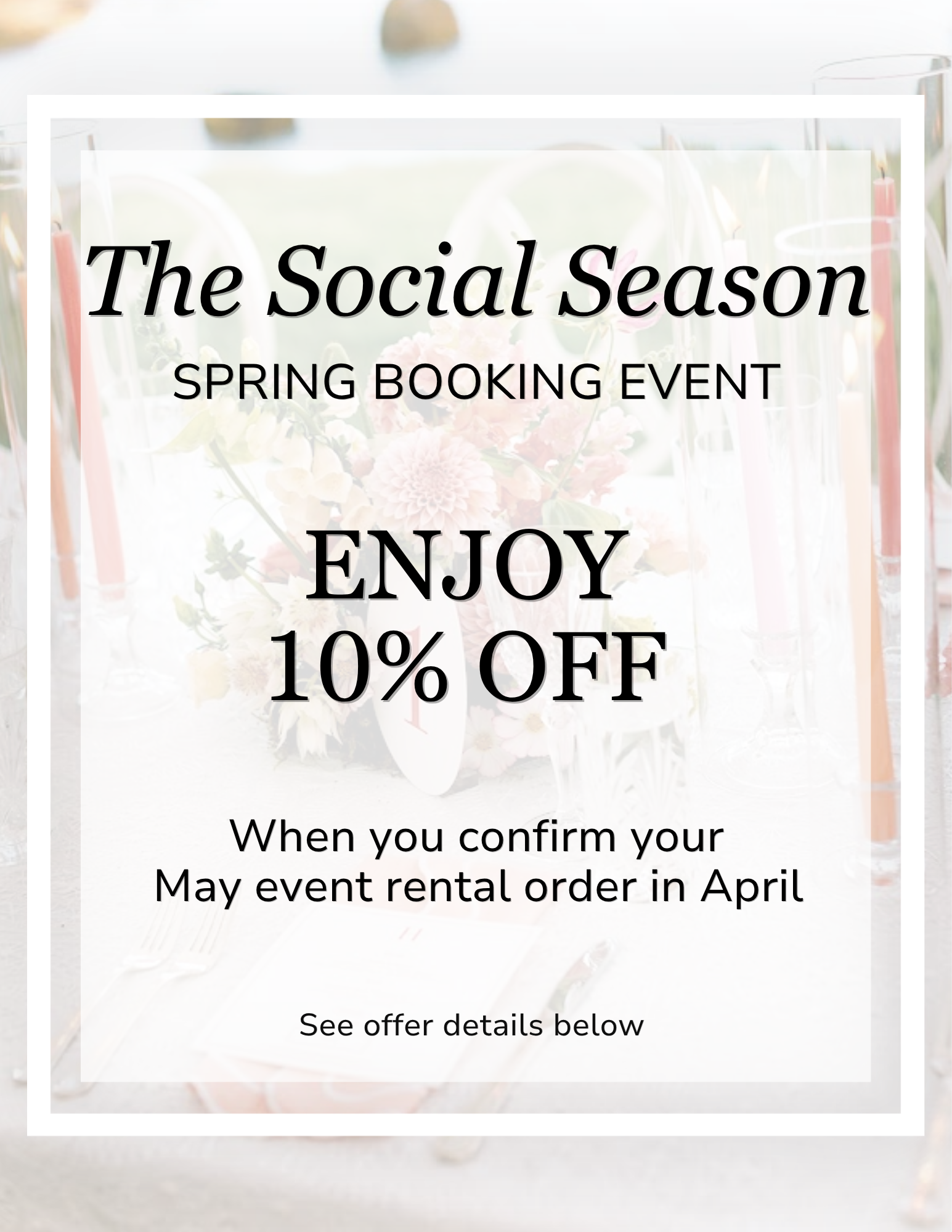 Reserve your May 2026 event rentals between April 6, 2026 – April 30, 2026 and receive 10% off general equipment rentals.